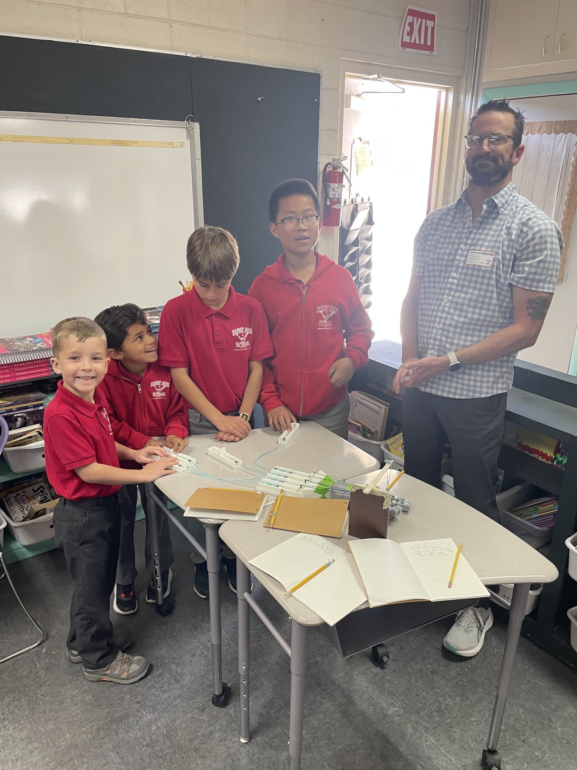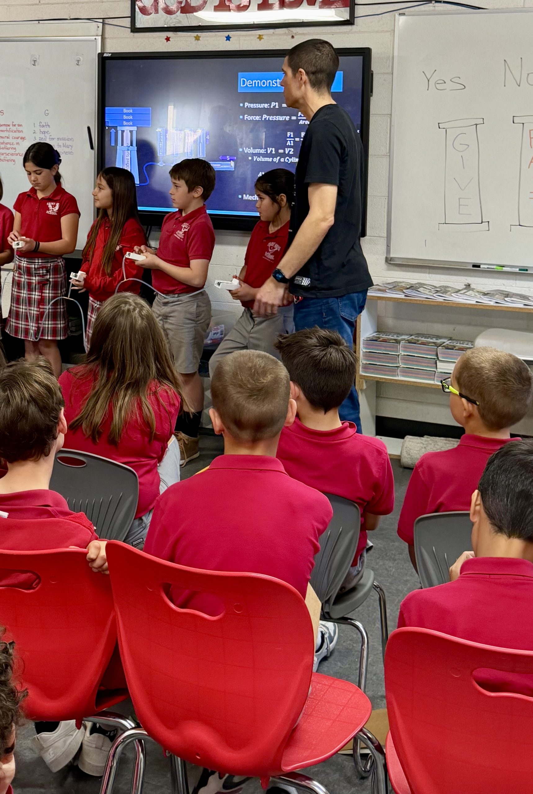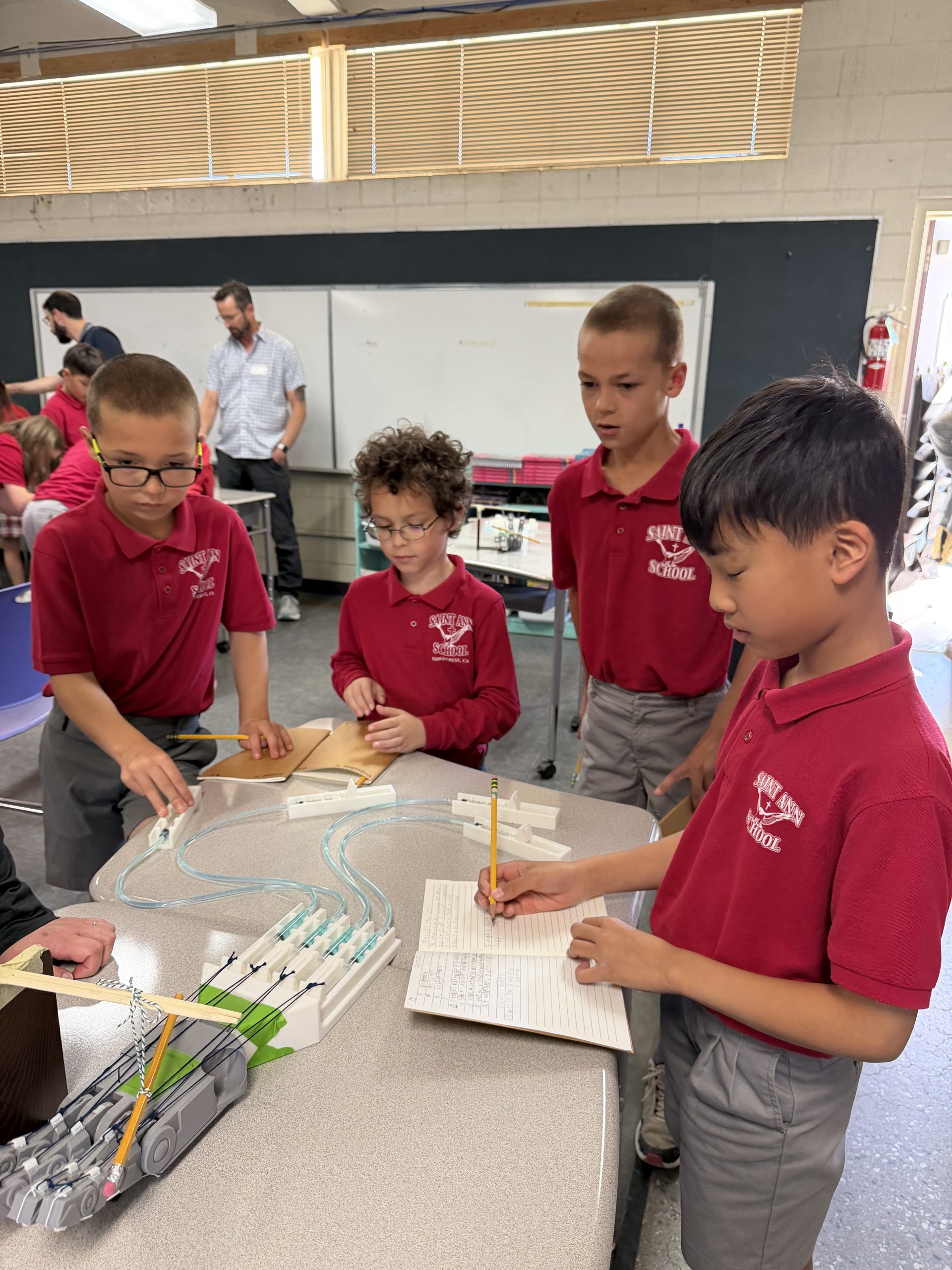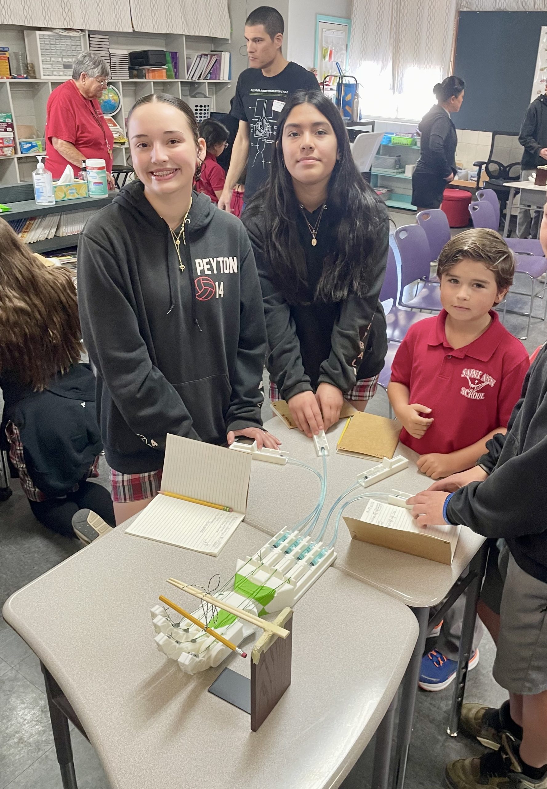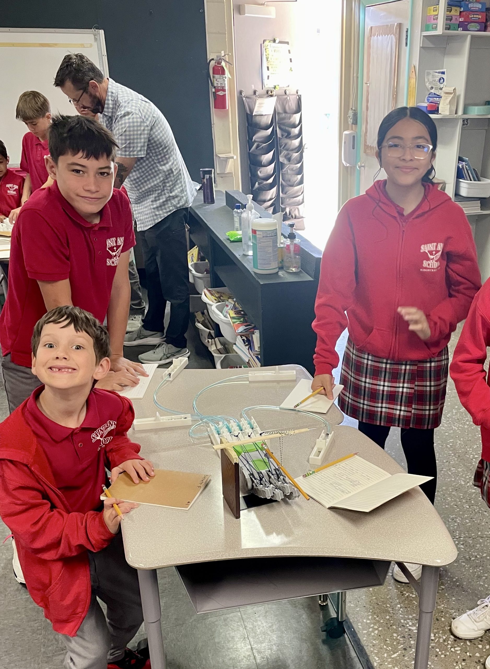 Students learned about the applications of hydraulics and Pascal’s Law.  Students were shown a demonstration of a hydraulic lifting system.  The older students calculated the increase in force as shown in Pascal's Law.  In small groups students also operated a robotic hand powered by hydraulics to grab an object.  Saint Ann School's STEM events are held monthly and organized by a group of dedicated parent volunteers.